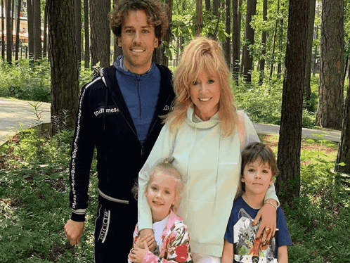 Russian singer Alla Pugacheva, her husband Maxim Galkin, and their children pose for a family photo outdoors.