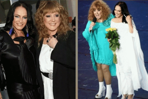 Singers Sofia Rotaru and Alla Pugacheva together, one holding flowers, performing their song 'Nas Ne Dogonyat'.