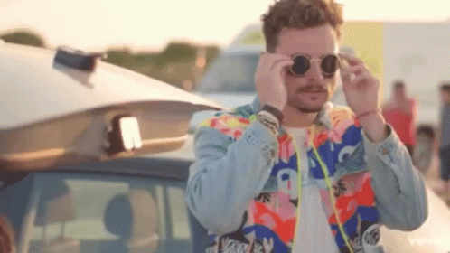 Pex Vso, a man in a vibrant colorful jacket and sunglasses, stands casually next to a car.