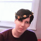 Amazing Phil looks confused wearing a flower crown, captured in a classic Phan moment.