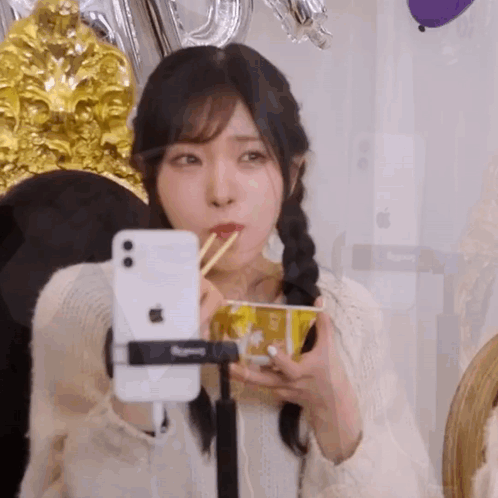 a woman is eating noodles with chopsticks in front of a camera .