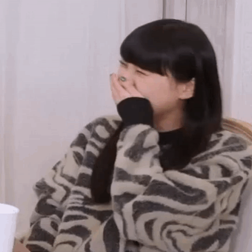 a woman in a zebra print sweater is covering her mouth with her hands .