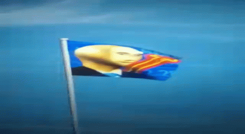 A blue and yellow flag featuring the 'Stonks Guy' meme face, representing 'Phase Mixed Harsh', waving.