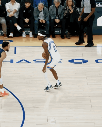 Shai Gilgeous-Alexander showcases his dribbling skills and scores a basket during an NBA game.