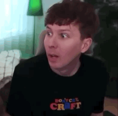 Phil Lester shows a surprised and gagged expression, wearing a black t-shirt.