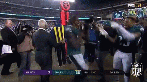 Philadelphia Eagles players celebrate on the field during a game, showing excitement after a play.