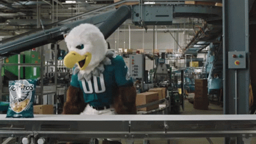 Philadelphia Eagles mascot Swoop gets excited with Tostitos chips on a factory conveyor belt.