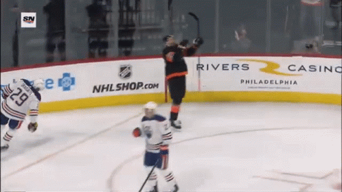 Philadelphia Flyers player Kevin Hayes celebrates a goal on the ice during a hockey game.