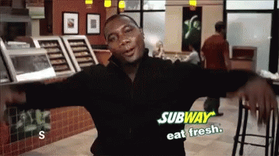 A man enthusiastically celebrates at a Subway restaurant, with the Subway logo and 'eat fresh' slogan visible.