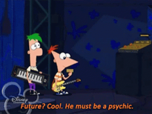 Phineas and Ferb react to a future prediction, with Phineas Flynn exclaiming, 'Future? Cool. He must be a psychic.'