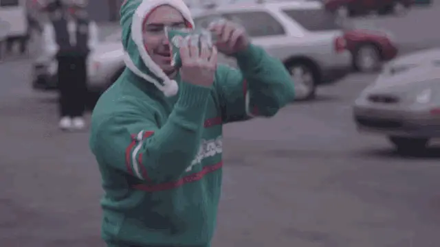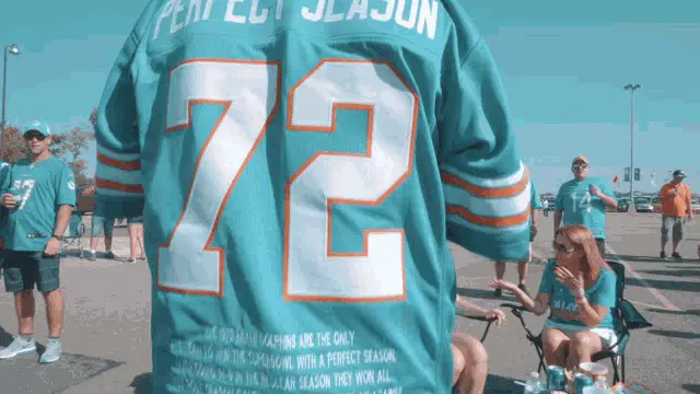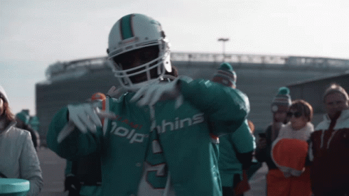 A Miami Dolphins fan in full gear, including helmet and jersey, celebrates at an outdoor event.