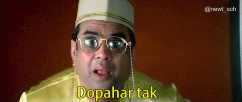 Babu Bhaiyaa from Phir Hera Pheri, wearing glasses and a white hat, saying 'Dopahar Tak'.