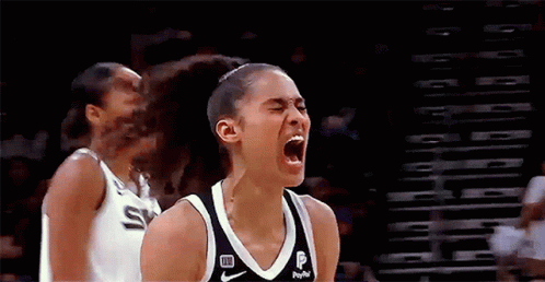 Skylar Diggins Smith of Phoenix Mercury yells intensely during a basketball game, showing her passion and energy on the court.