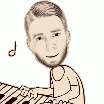 Cartoon illustration of a man with a beard playing the piano, with musical notes floating around him.
