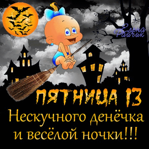 Cute cartoon of a baby witch on a broomstick, wishing a happy Friday the 13th.