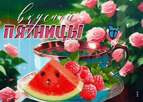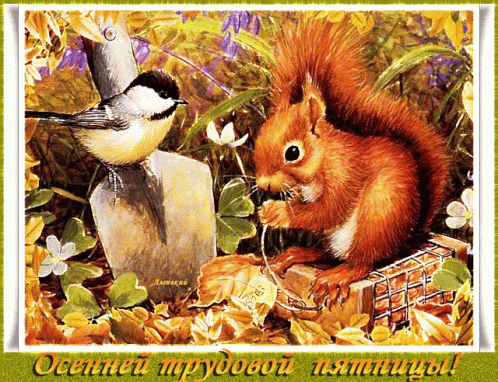 A charming painting depicting a squirrel and a bird, with the Russian text 'Autumn working Friday!' by Lysenko.