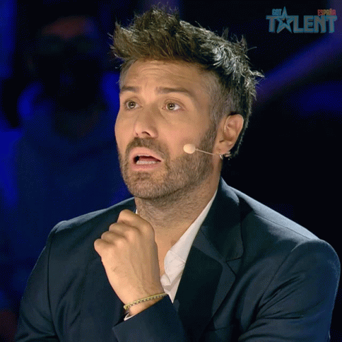 Dani Martínez reacts with an eye twitch during Got Talent España, looking surprised or deep in thought.