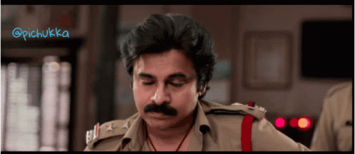 Pawan Kalyan, also known as Power Star PK, as a police officer with a mustache in a scene from Pichuka Pichukka.