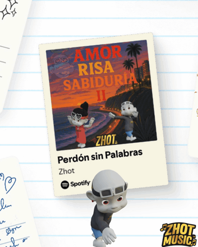 a cartoon character standing next to a poster that says amor risa sabiduria ii
