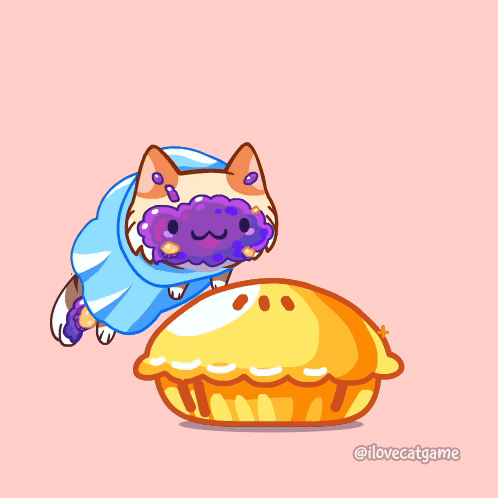 An adorable animated cat celebrates Happy Pi Day, covered in blueberry pie filling and surrounded by pies.
