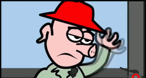 A bored pig-like cartoon character, wearing a hard hat, takes a drag from a cigarette.