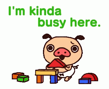 An adorable cartoon piglet in a diaper is busy playing with colorful building blocks, with the text 'I'm kinda busy here.'