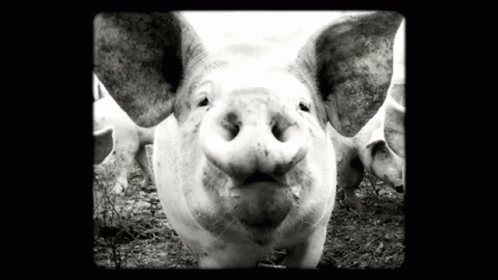 A striking black and white close-up of a pig's face, looking directly at the camera with its snout prominent.