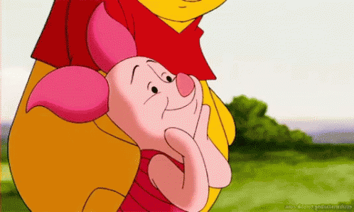 Winnie the Pooh lovingly holds and hugs his best friend Piglet, sharing a sweet moment.