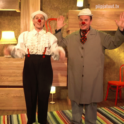Piip Tuut clowns perform a playful bow and wave, bringing joy and laughter.