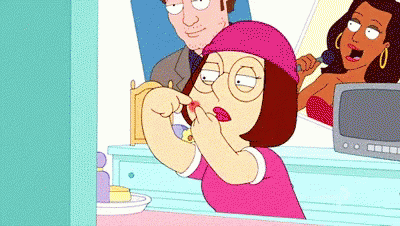 Meg Griffin from Family Guy pops a pimple on her face while looking in a mirror.