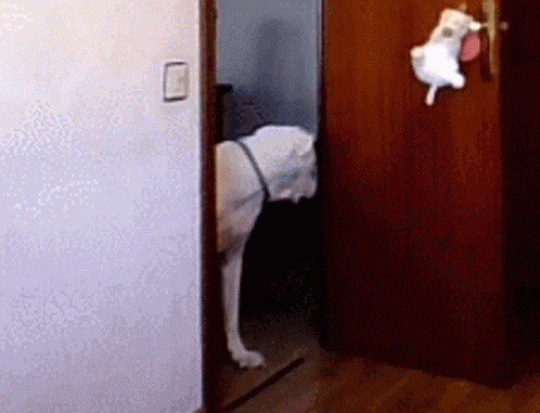 Piña the white dog curiously peeks its head through a doorway, observing its surroundings.