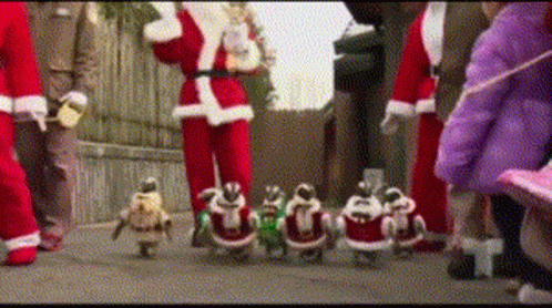 Adorable penguins dressed in Santa Claus and elf costumes waddling in a festive Christmas parade.
