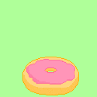 A pixel art animation of a pink-frosted donut, first with colorful sprinkles, then without, on a green background.
