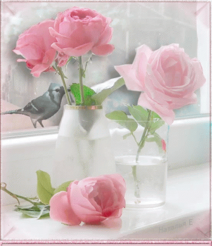 Elegant pink roses in vases on a windowsill, with a sparrow perched outside in the background.