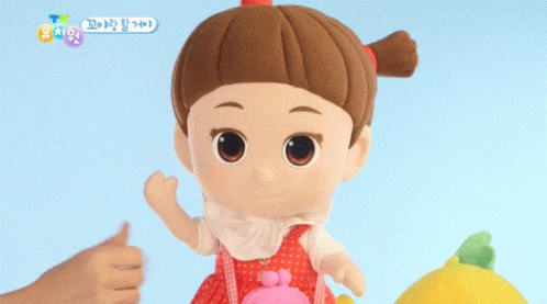 A Kkoya doll from the Korean TV Kindergarten show makes a pinky promise gesture with a human hand.