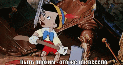 Pinocchio from Disney's animated film holds a large hammer, with Russian text saying 'being bad - it's so fun'.