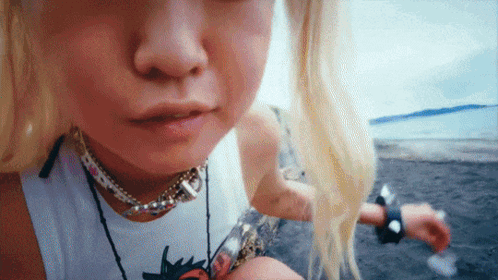 a close up of a woman 's face with a lot of necklaces around her neck