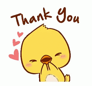 Cute cartoon chick Pio expresses gratitude with hearts, saying "Thank You" with a happy expression.