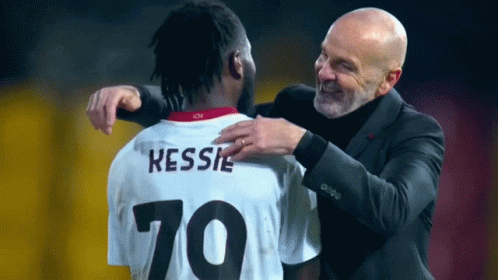 AC Milan coach Stefano Pioli shares a warm embrace with player Franck Kessie on the field.