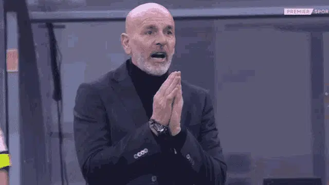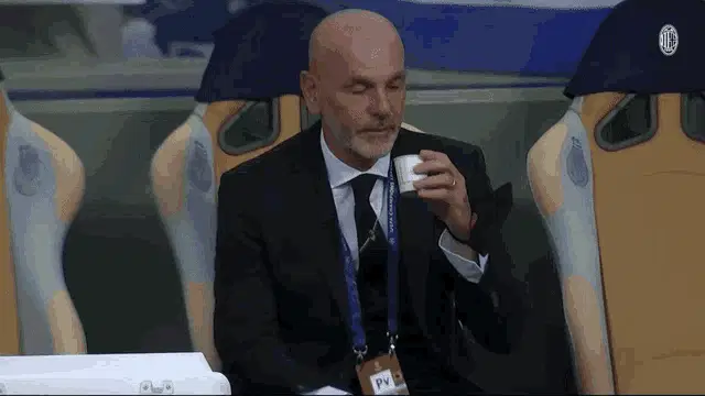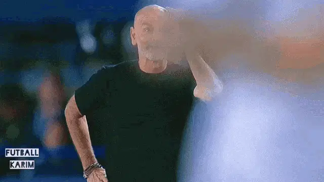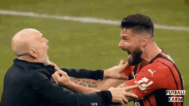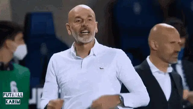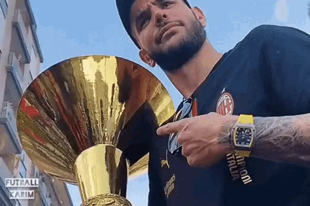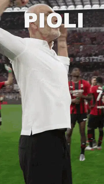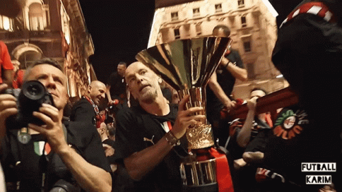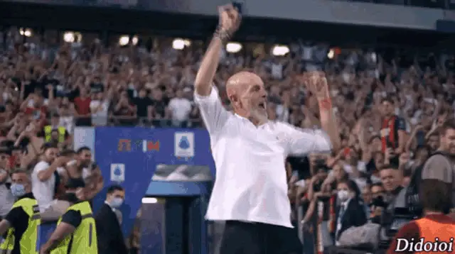 Stefano Pioli, coach of AC Milan, proudly lifts the Serie A Scudetto trophy amidst a cheering crowd during championship celebrations.