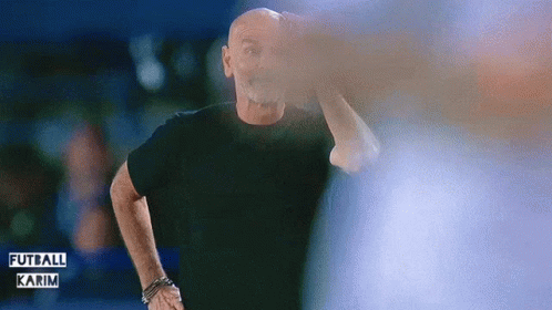 Stefano Pioli, the bald football manager, reacts with a surprised or frustrated expression, holding his head.