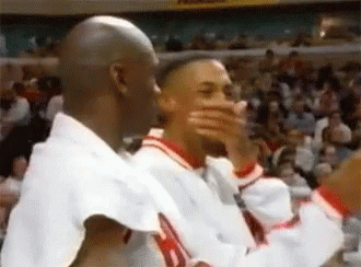 Scottie Pippen and Michael Jordan share a laugh on the sidelines during a Bulls basketball game.