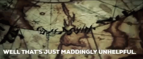 Johnny Depp as Captain Jack Sparrow in Pirates of the Caribbean, reacting to a map with 'Up Is Down' written on it.