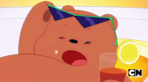Tri Be, the bear from We Bare Bears, winks while wearing cool sunglasses and holding a drink.