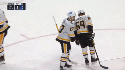 Bryan Rust of the Pittsburgh Penguins celebrates a goal with teammate D. Smith during a game against Buffalo.
