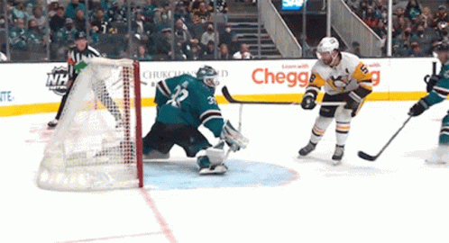 Pittsburgh Penguins defenseman Kris Letang scores a goal against the San Jose Sharks goalie.