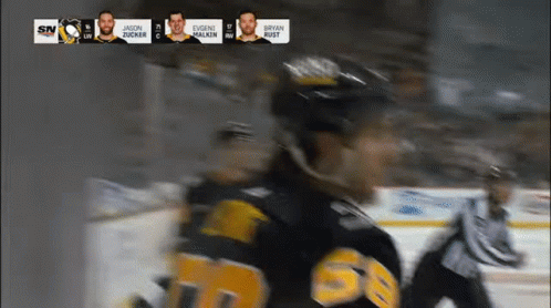 Kris Letang of the Pittsburgh Penguins celebrates on the ice with teammates Evgeni Malkin and Jason Zucker.