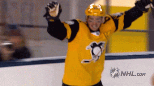 Sidney Crosby, captain of the Pittsburgh Penguins, celebrates a goal on the ice in his yellow jersey.