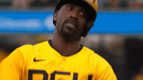 Pittsburgh Pirates player Andrew McCutchen celebrates on the field, raising his fist in triumph.
