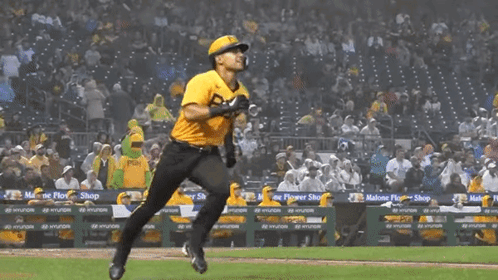 Nick Gonzales, a Pittsburgh Pirates baseball player, runs across the field in his yellow jersey.